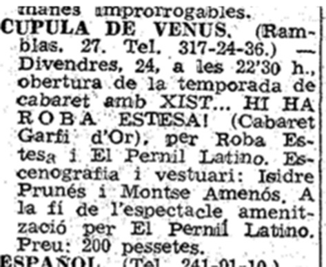 La inauguración de la Cúpula tuvo lugar el 24 de noviembre de 1978, y Roba Estesa lo comunicaba con un anuncio en la cartelera de La Vanguardia en el apartado de Teatros, con el espectáculo «Xist… hi ha roba estesa!.
