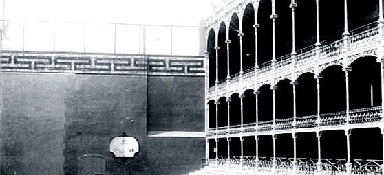 Desde el interior del vestíbulo partían dos grandes puertas, con columnatas, estilo renacimiento, que llevaban hasta un corredor, conducían a la pista de juego y a la gran escalera de mármol, de cinco metros que conducía a los palcos y al salón de descanso.
