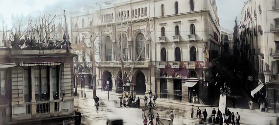 Un poco más abajo nos encontramos con la calle Conde del Asalto, actual “Nou de La Rambla”, una de las calles más importantes de primeros de siglo XX. Era la calle más utilizada por los carruajes de una forma desenfrenada para desplazar a los clientes de los espectáculos a la entrada y salida de los locales hasta los puntos de recogida.